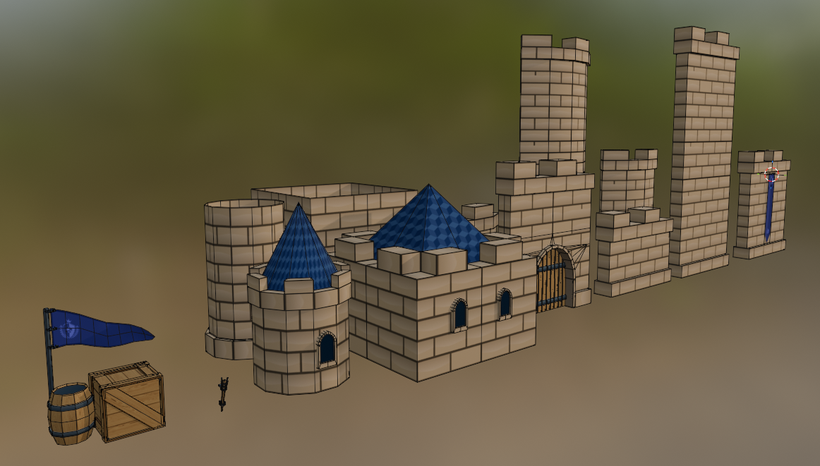 – Medieval props (barrels, crates, torches, banners)